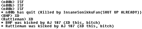 ![]() SirB wasn't the only one losing his wits, as SShadowSuper sent in mass ammounts of n00bs to try and bring down #cult. Everyone was feeling the pain of mass ammounts of concentrated stupidity.