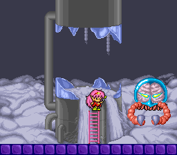 The second boss of Chapter 2, normally a crocodile, has become the brain boss, albeit with an incorrect color palette and the tentacle arms replaced with a couple black balls. The boss also lacks a hitbox, which means it is unbeatable and the game soft locks at this point. (For comparison, the second image above is the brain boss from the final version.)