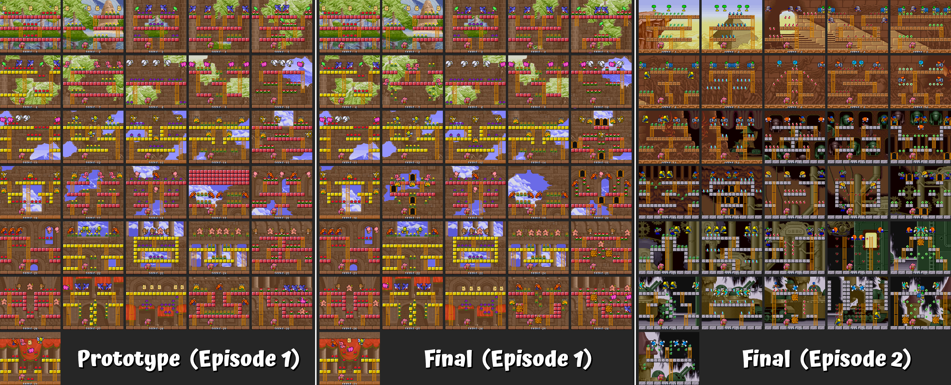 One of the strangest aspects of the prototype are the player sound effects, which are very different from the final version. They seem to use samples of sounds made by human voices. For example, the sound when Tam collects a flower is food-munching sound, and when Rit creates a ladder, there’s a ‘oof’ sound; when a bomb explodes there’s a ‘P-P-PLEH’ sound. They don’t really work as good sound effects and stand out noticeably. I can’t decide if they were placeholders or if it was a stylistic choice. The voice samples remain in the final version: they can be heard in sound IDs 20 through 25 in the standard sound test.